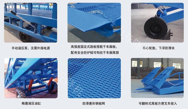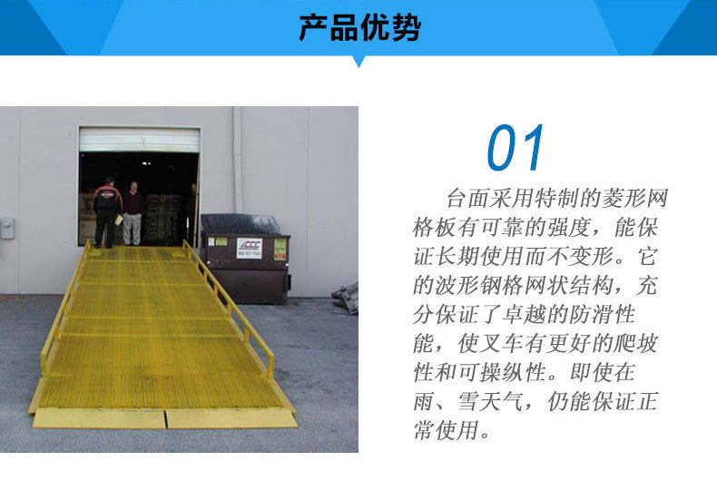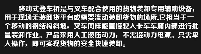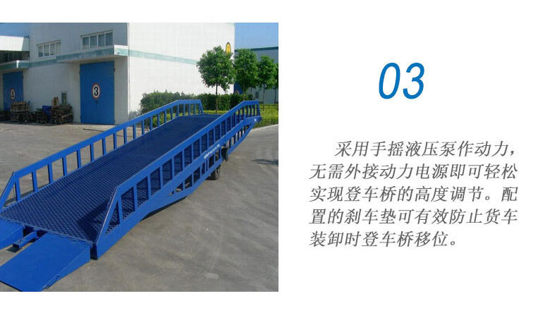 移動(dòng)式登車橋是與叉車配合使用的貨物裝卸專用輔助設(shè)備,用于現(xiàn)場無裝卸貨平臺或需要流動(dòng)裝卸貨物的場所。它相當(dāng)于一個(gè)移動(dòng)的鋼結(jié)構(gòu)斜坡,叉車同樣能直接駛?cè)肟ㄜ囓噹麅?nèi)部進(jìn)行批量裝卸作業(yè)。產(chǎn)品采用人工液壓動(dòng)力,不需接動(dòng)力電源。只需單人操作,即可實(shí)現(xiàn)貨物的安全快速裝卸。它可使企業(yè)減少大量勞動(dòng)力,成倍提高裝卸作業(yè)效率,加快貨物流通速度,獲取更大的經(jīng)濟(jì)效益。