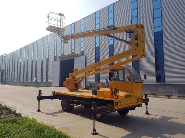 車載折臂式升降機(jī):把曲臂式升降機(jī)安裝在汽車上,利用汽車動(dòng)力驅(qū)動(dòng)升降,適合遠(yuǎn)路程的野外高空作業(yè)。