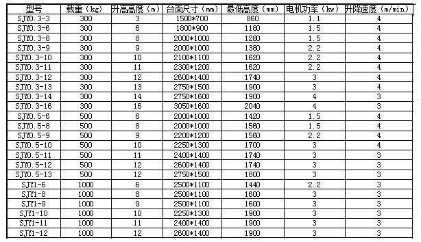 根據(jù)升降機高度分為4、6、8、10、12、14、16、18米.....,載重分為:300、500公斤、1000公斤和2000公斤不等其它載重量可以訂制加工。